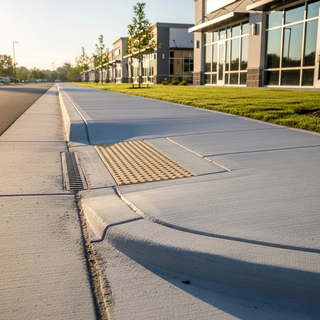 Sidewalks meet ADA slope standards (1:20 longitudinal, 1:48 cross) with truncated domes for pedestrian safety. Expansion joints and proper edging ensure clean finishes and long service life.