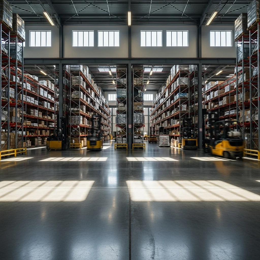 Moisture control is achieved through vapor barriers and densifiers, producing smooth, dust-free surfaces with flatness tolerance ratings of FF40/FL30+, suitable for racking systems and precision machinery.