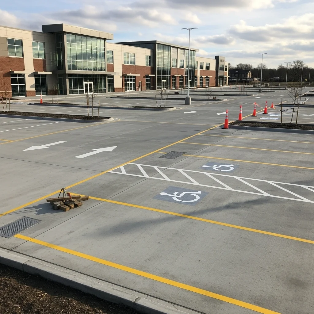 Reinforcement uses dowels, tie bars, and thickened edges at drive lanes and stalls to prevent edge failure. Finishes range from broom-textured for traction to machine-troweled for smooth warehouse interiors. Optional services include sealcoating and line striping to improve surface protection and visibility.